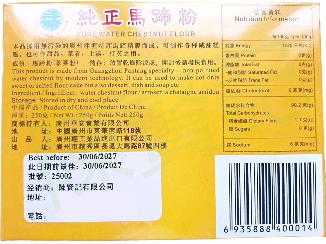 本品採用無污染的廣州泮塘特産馬蹄精製而成,可制作各種咸甜糕點,也可作甜品、菜肴、上湯、打芡之用