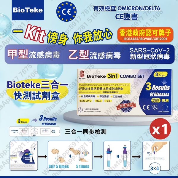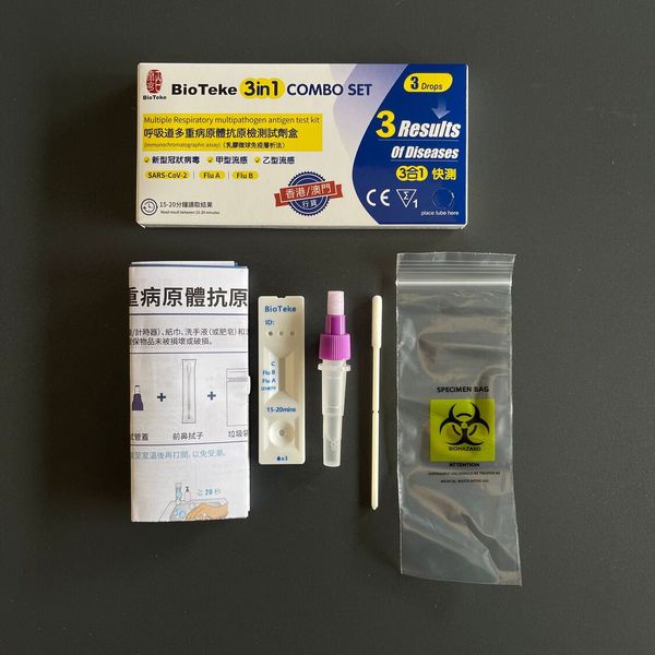 BioTeke-(1盒) (3合1) 新冠病毒/甲/⼄型流感快速抗原檢測試劑盒 【額外加送拭子適合兒童採樣用】