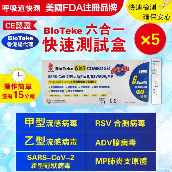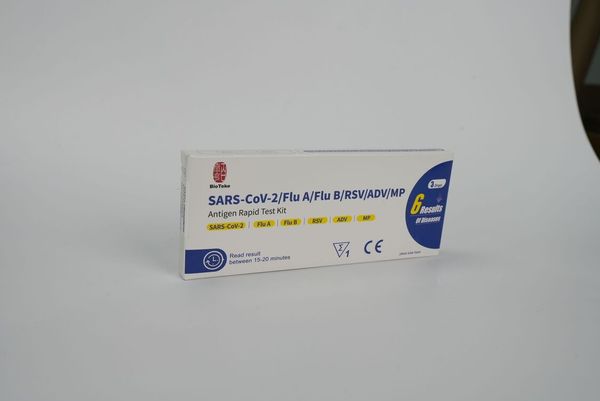 BioTeke-6合1 新冠病毒/甲/⼄型流感/RSV合胞/ADV腺病毒/MP&Flu肺炎快速抗原檢測試劑盒 5支(獨立包裝)**(新舊包裝隨機)【額外加送拭子適合兒童採樣用】
