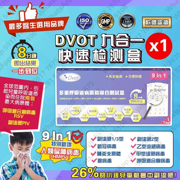 DVOT-【1支】【9合1】 副流感2型/副流感1/3型/新冠病毒測試/甲/⼄型流感/RSV合胞/ADV腺病毒/MP&Flu肺炎/人類偏肺病毒(單支裝) 歐盟CE認証