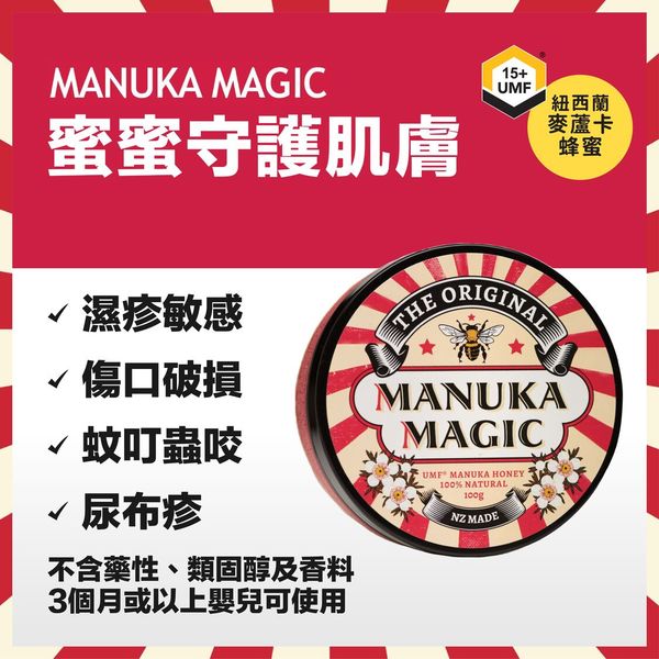 配方採用UMF 15+紐西蘭麥盧卡蜂蜜和精煉麥盧卡油。強效天然抗菌,紓緩炎症過敏皮膚,協助消退紅腫疤痕。配方中更含蜂蠟﹑ 金盞花油﹑ 洋甘菊﹑ 達至鎖水透氣,滋潤乾燥肌等功效。榮獲紐西蘭BioGro有機認證,不含藥性﹑ 類固醇﹑香料。適合3個月以上嬰幼兒及成人使用。變走各類肌膚煩惱。臨床實證,持續使用三天有助縮小傷口範圍超過一半或以上*。