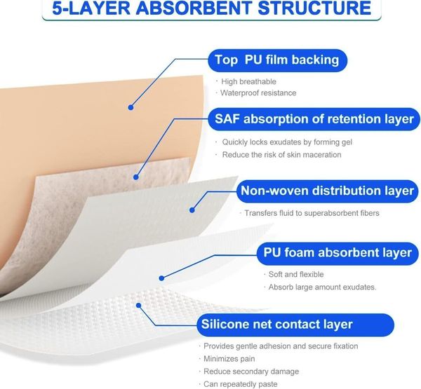硅凝膠有邊型泡沫敷料是一種柔軟、吸收性良好的傷口敷料,旨在控制滲出液,同時為嬌嫩敏感的皮膚提供溫和的黏附和緩衝。它主要由聚氨酯薄膜、聚氨酯泡棉和矽膠黏合劑組成。適用於各種滲出性傷口,例如腿部和足部潰瘍、壓瘡和創傷性傷口,皮膚撕裂和繼發性癒合傷口。