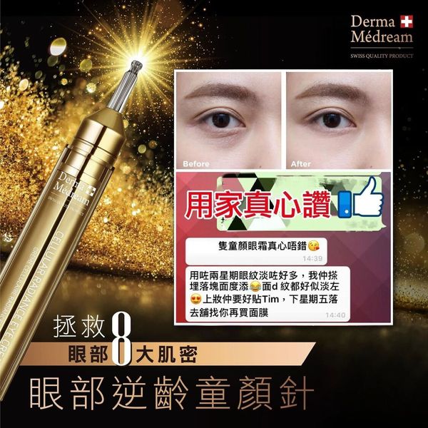 Derma Medream眼部逆齡童顏針,結合瑞士尖端技術及配方,能有效填充肌底細胞凹陷處,減少眼周細紋,收緊眼袋,同時為眼周肌膚提供及鎖緊水份,維持眼部肌膚保持柔軟及彈性。藴含8大童顏逆齡眼部嫩肌成分,深層眼部肌膚重塑效能,有效刺激肌膚微循環,減退眼部皺紋及浮腫、滋養、修正、提升眼周肌膚,令雙眼重現活力。配方具有高度抗氧化功效,並可解决乾燥及敏感的眼部肌膚。 眼部輪廓再現。