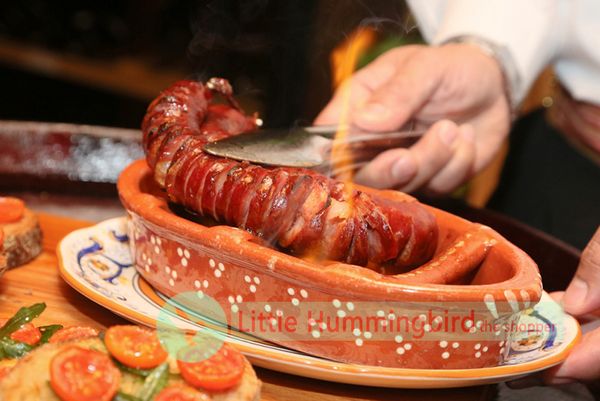 葡國臘腸有好幾種,其中用火烤的是豬肉腸(chouriço),外觀跟台灣香腸差不多粗,但大概是2-3條台灣香腸這麼長。