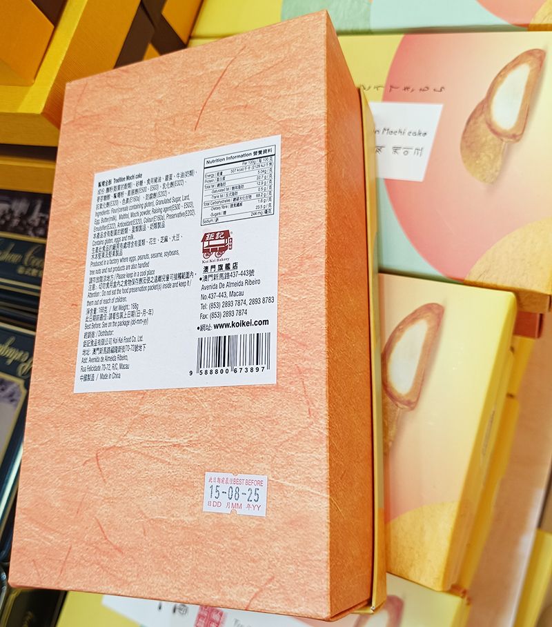 產品成份 : 麻糬粉, 麵粉, 雞蛋, 牛油, 食用豬油, 麥芽糖醇, 發粉, 乳化劑, 食用色素, 抗氧化劑, 防腐劑, 糖