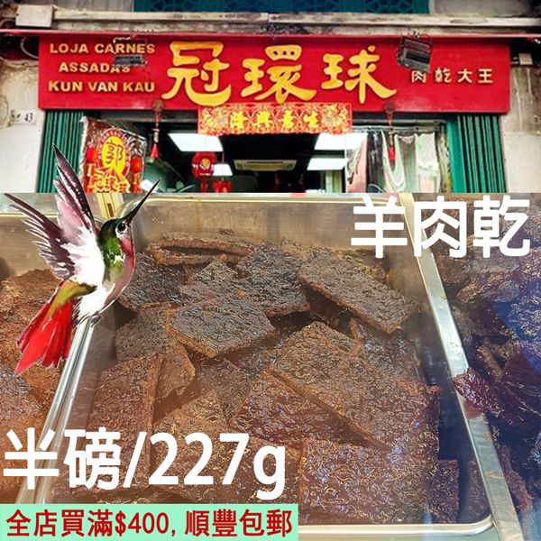 冠環球 新鮮炭烤 羊肉乾 半磅227gX1袋 澳門肉乾大王 百年老號 BBQ Lamb Jerky 有汁 人氣澳門手信 特產 (即埸密封入袋 採購當日寄出) 澳門直送 無防腐劑 平行進口