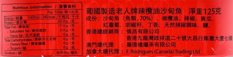 產品成份 : 沙甸魚(魚-最少70%), 橄欖油, 辣椒, 黃瓜, 紅蘿蔔, 辣椒種子, 丁香, 鹽 (絕不加防腐劑! ! !)