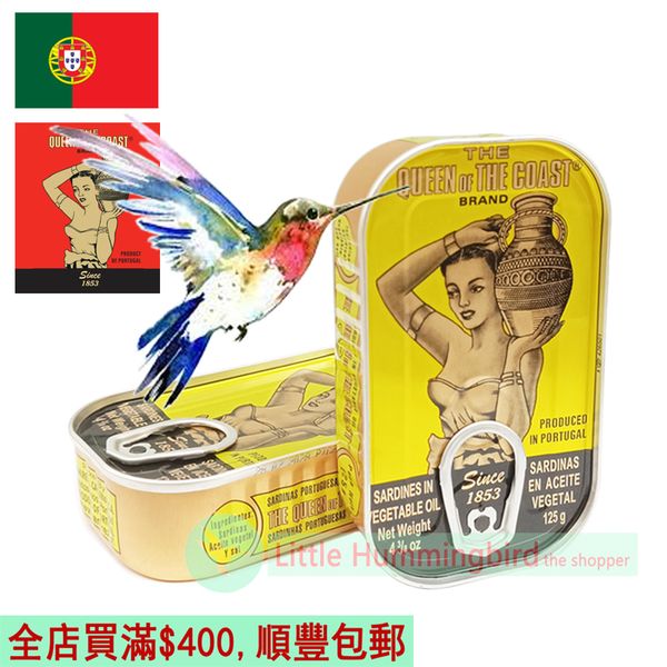 葡國西洋女皇牌 油浸沙甸魚(黃罐) 125gX1罐 澳門進口 Portugal 葡萄牙百年品牌 The Queen of the Coast 沙甸魚罐頭 烤烘臘醃魚 澳門直送 無防腐劑 平行進口