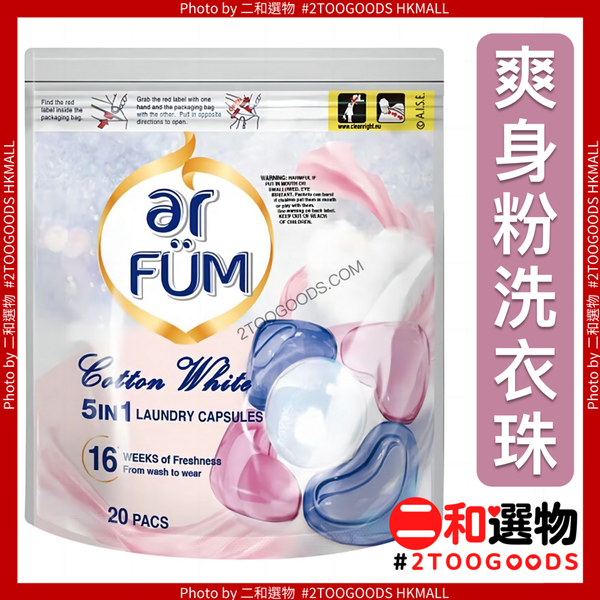 紡優美-Ar Fum 5合1 爽身粉洗衣心心珠 20粒裝 (4260608937931 ) 輕柔爽身粉 密實袋裝 洗衣珠 洗衣球 令衣物柔順 去漬不留痕 護色 持久留香 深層潔淨