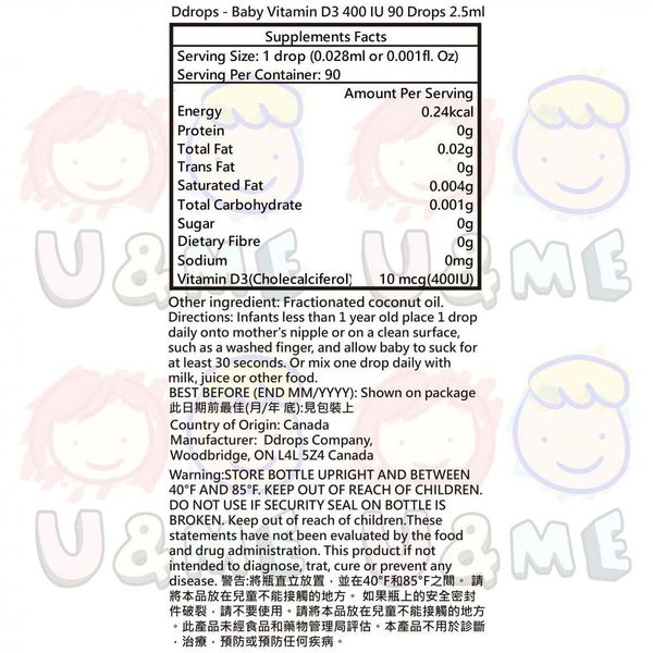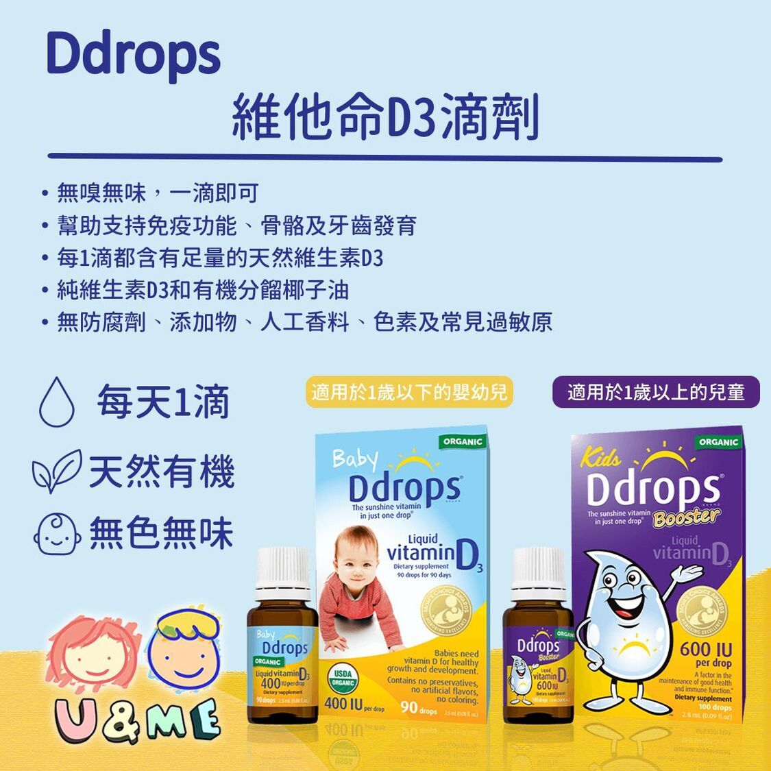 2.用法:把Ddrops瓶蓋打開,把瓶子完全倒過來、瓶口朝下,保持大約1-2秒鐘(特殊瓶口設計,通常先出來的滴液會倒流回瓶子,再出來的滴液才會形成一整滴滴下來),將一滴(含量400IU)維生素D滴在安撫奶嘴或MAMA的乳頭上,讓寶寶吮奶嘴或乳頭30秒种以上即可。或者也可加到寶寶輔食,果汁或其他食物裡。