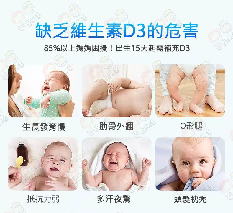 母乳中只含有維他命D每日推薦攝入量的10%,即使是配方奶餵養的寶寶,每日也同樣需要攝入400國際單位的量,如果每250毫升配方奶中含有100國際單位的維生素D,那麼寶寶一天需要喝1000毫升的配方奶才能達到推薦的維生素D攝入量。純植物提取維生素D,容易吸收,每日只需一滴,可以滴在媽媽的乳頭,安撫奶嘴上,400IU的含量,能滿足嬰兒每天對維生素和礦物質的需要,每日給寶寶添加適量的Baby維生素D滴劑,你的寶寶就可以得到正確劑量的維生素D來幫助他們強健骨骼和牙齒。