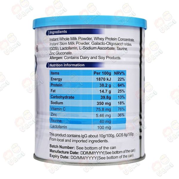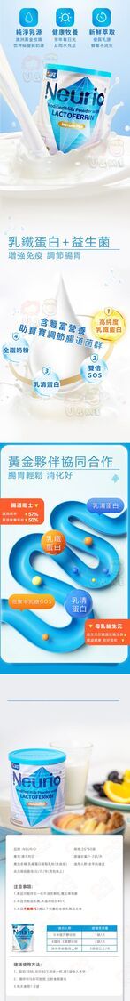 速溶全脂奶粉、濃縮乳清蛋白、脫脂奶粉、低聚半乳糖 (GOS)、乳鐵蛋白、L-抗壞血酸鈉、牛磺酸、葡萄糖酸鋅