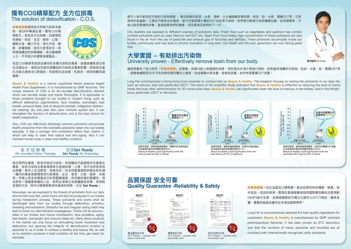排毒美顏寶更特別委託本港大學進行測試,針對最常接觸的污染物,包括:水銀、鉛、農藥DDT等,證實連續服用30天可有效降低積存體內之毒素,包括腎臟水銀含量、股骨鉛含量、血中有害農藥DDT含量。這結果顯示排毒美顏寶能有助排走積存的多種污染物及毒素,保護身體免受日常生活裡從水、食物及空氣中接觸到的污染物及毒素影響;有助對抗自由基、抗衰老,保持身體長遠健康。