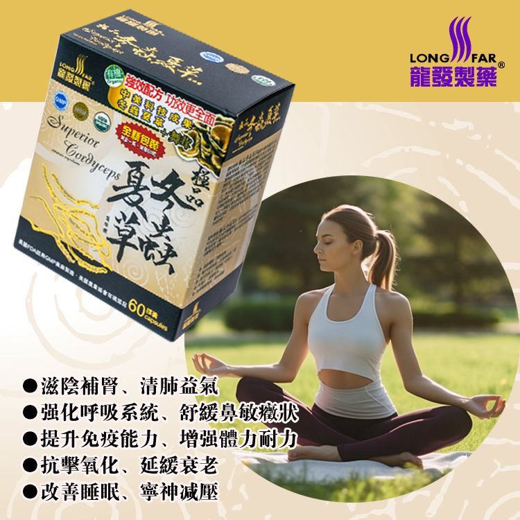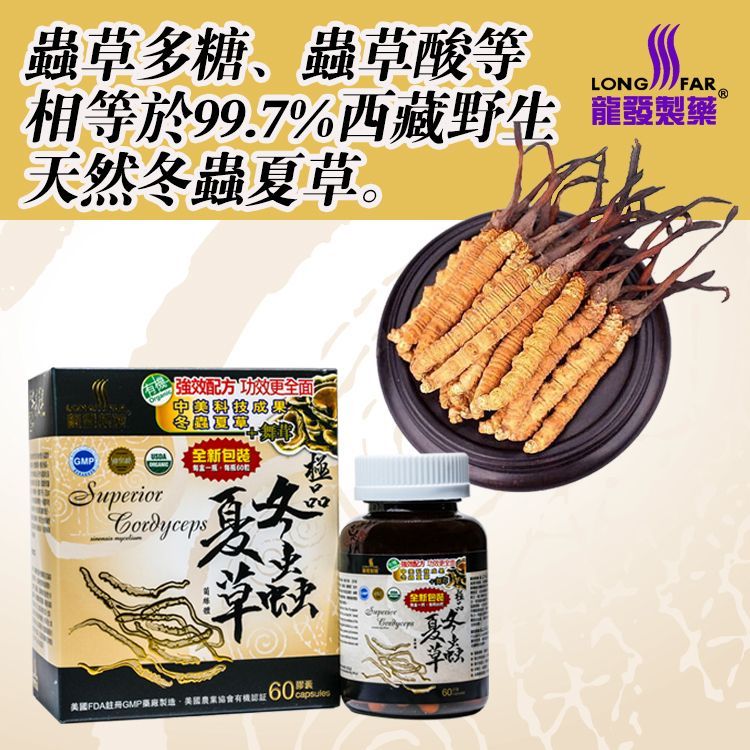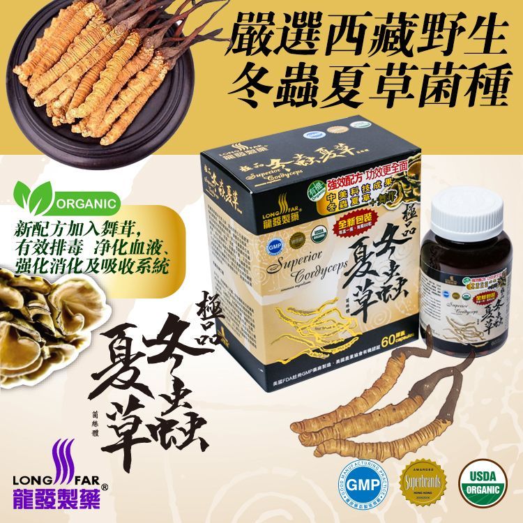 龍發製藥 極品冬蟲夏草嚴選西藏野生冬蟲夏草菌種;於實驗室進行有機培植。經高精密指紋圖譜監証,成份結構相等於99.7%西藏野生冬蟲夏草王。配方還特別加入了舞茸,可促進人體復原力,有效維持細胞平衡,補充肝臟養份,將毒素迅速清除,以淨化血液,增加血液含氧量,並能令睡眠質素提升,健脾益胃,有效提升消化及吸收力。再配合具有強效抗氧化功能的綠茶多酚可擊退自由基,並能加速冬蟲夏草及舞茸互動,使功效倍增。