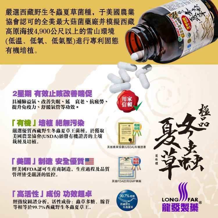 龍發製藥極品冬蟲夏草,經中國SFDA認可之GMP藥廠製造,所有製成品都經過嚴格監控,確保重金屬、微生物及殘留農藥符合國際安全標準。