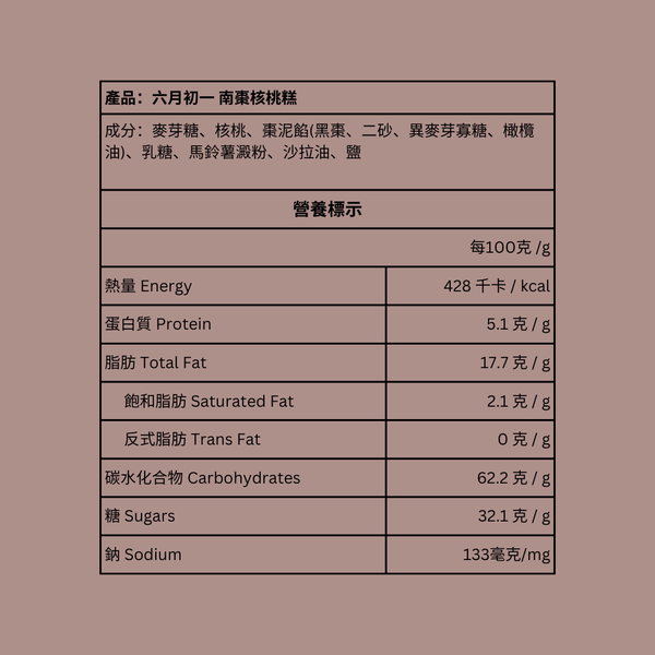 成分:麥芽糖、核桃、棗泥餡(黑棗、二砂、異麥芽寡糖、橄欖油)、乳糖、馬鈴薯澱粉、沙拉油、鹽