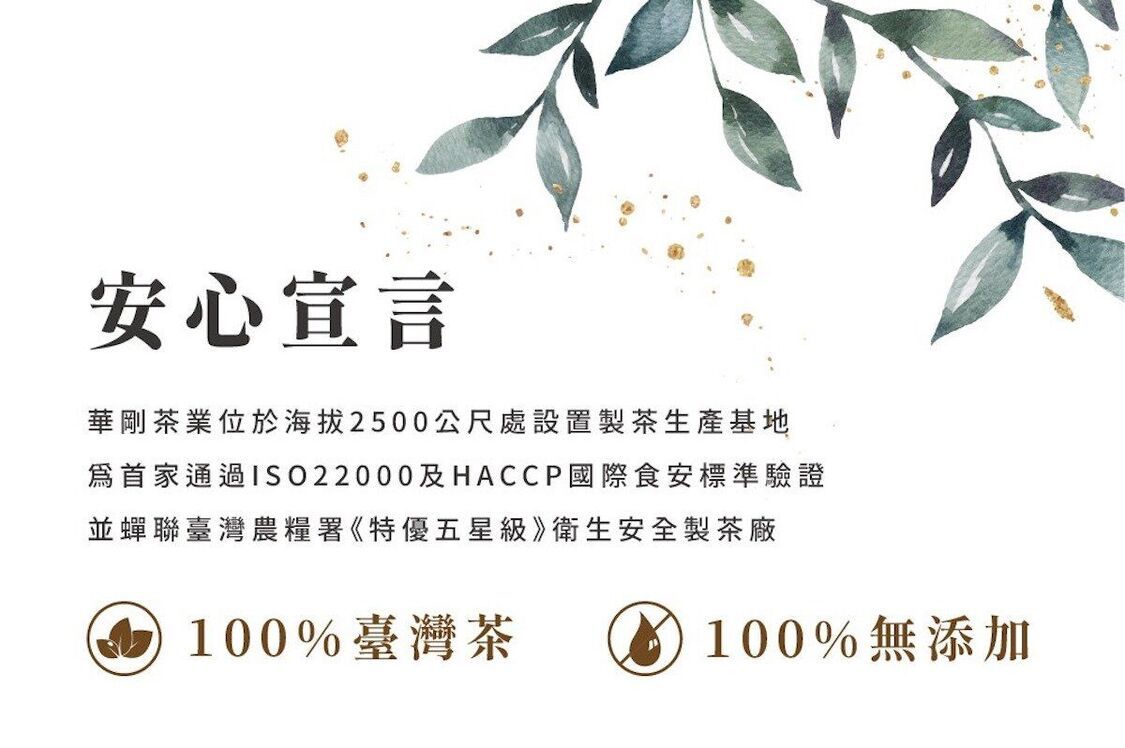 華剛茶業在台灣有超過100年的歷史,深入台灣中央源頭山脈產地,在位於海拔2500公尺處設置製茶生產基地。為首家通過ISO22000及HACCP國際食安標準驗證並蟬聯臺灣農糧署《特優五星級》衛生安全製茶廠。