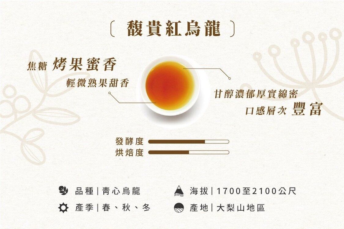 梨山紅水烏龍,產自台中市和平區及南投縣仁愛鄉之高海拔茶區,日夜溫差大形成茶菁內豐富的果膠質,以傳統凍頂烏龍工藝,輔以重萎凋、中重氧化,中烘焙製程,結合可遇不可求的小綠葉蟬叮咬下的茶菁,產生天然悠雅、層次豐富的蜜果甜香、木質熟果香及秀雅的高山花果香、茶湯溫潤厚實、濃郁甘醇、琥珀茶湯風味獨特多元,是喜愛傳統凍頂或普洱茶、大紅袍風味的雅土,一定不能錯過的特殊茶品。