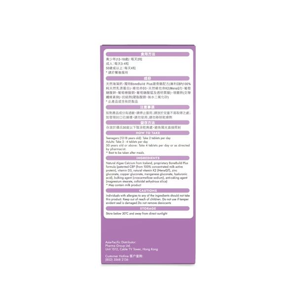 蘊含超過70種天然海洋礦物質和微量元素,專利CBP (100%純天然乳清蛋白) 及活性維他命D (Vitamin D3),配合天然維他命K2 (MenaQ7),提升造骨細胞的運用率及減少鈣質流失。