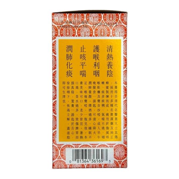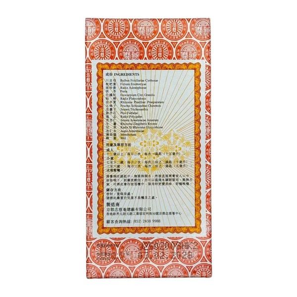 本產品含有川貝母、枇杷葉、茯苓、化橘紅、桔梗、苦杏仁、杏仁水、甘草、薄荷腦等有效成份,並以麥芽糖醇化替傳統蜂蜜。