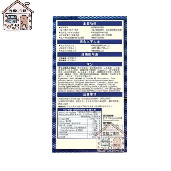 瑪卡提取物、鋸棕櫚提取物、L瓜氨酸、L鳥氨酸鹽、酵母(含鋅)、葫蘆巴種子提取物、黑豆種皮提取物、南瓜籽提取物、L精氨酸、牛磺酸