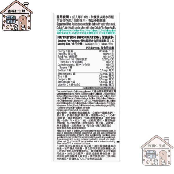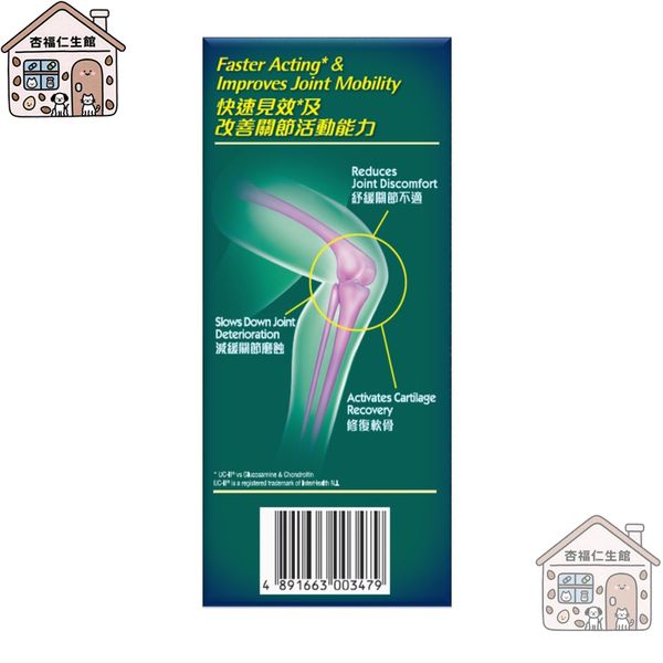 UC-II 不含藥性,適用於關注關節健康的成年人士,每日一粒,30日*,關節減痛,柔韌靈活。配方配有維他命C及鎂、鋅、銅、錳四大礦物質,以促進骨膠原合成,有助維持骨骼-韌度及靈活性。