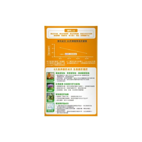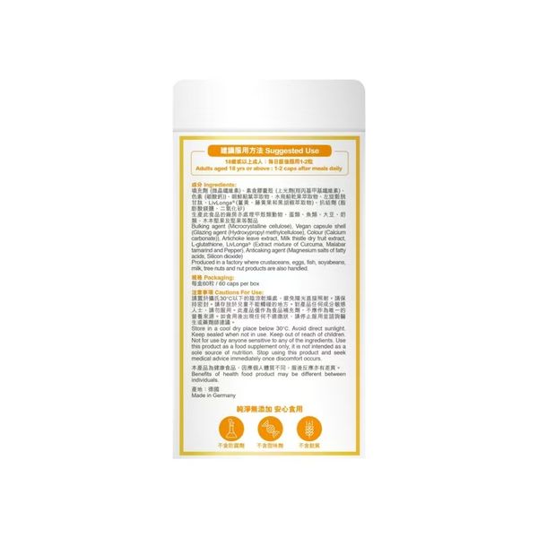 色素(碳酸鈣))、朝鮮薊葉萃取物、水飛薊乾果萃取物、左旋穀胱甘肽、LivLonga®(薑黃、藤黃果和黑胡椒萃取物),抗結劑(脂肪酸鎂鹽,二氧化矽)