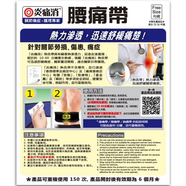 「炎痛消」熱灸帶不含藥性,並已通過 「香港標準及檢定中心」及「廠商會檢定 中心」有關「致敏」、「致癌物」、「重金 屬」及「輻射」等多項安全測試,證實安 全可靠,無副作用,並可重複使用。