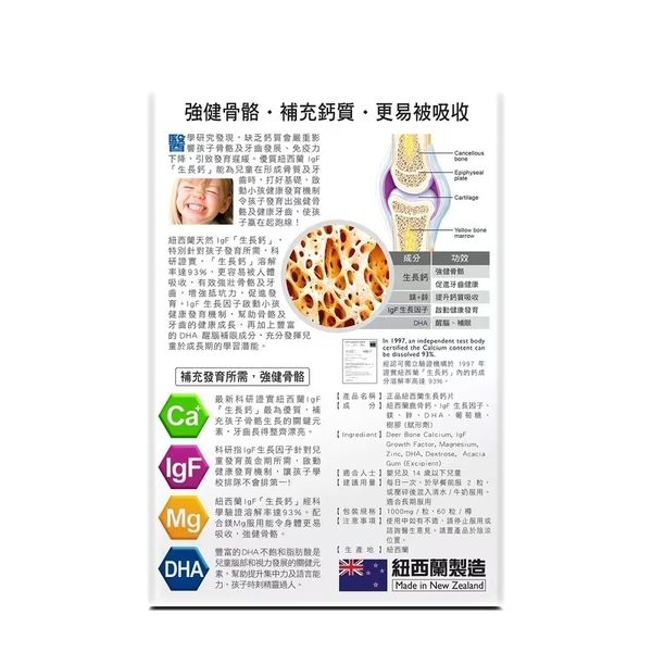 紐西蘭鹿骨萃取出「鹿骨鈣」是最為優質,它含極豐富IgF生長因數,科研指鹿骨鈣溶解率高達93%,更易被人體吸收。