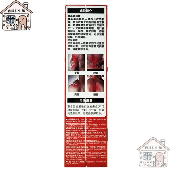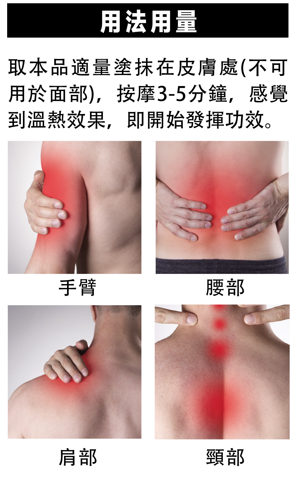 取本品適量塗抹在皮膚處(不可用於面部),按摩3-5分鐘,感覺到溫熱效果,即開始發揮功效。
