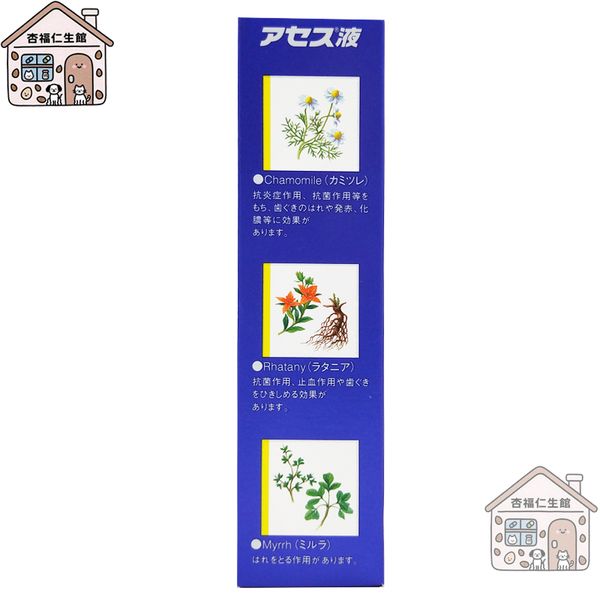 • 以 3 種歐洲天然草藥製成,洋甘菊精華、拉坦揘根精華及沒藥精華:可消炎殺菌,有效對付齒槽及牙齦炎引致的細菌,具消腫功效;亦可減低口氣、口臭等症狀。