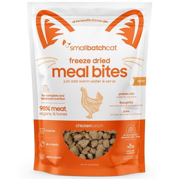 單一來源蛋白質、完整的凍乾貓糧,含有 98% 的肉類、內臟和骨頭配方。與其他品牌不同,Smallbatch僅使用人道飼養的整塊肉和來自天然食品的營養成分。餐食被分成方便一口大小的小塊,很容易補充水分和食用,或用作鬆脆的加餐。放心地為您的肉食貓貓提供經過最低限度加工、受自然啟發的飲食。