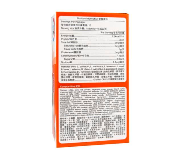葡萄糖、木糖醇、脱脂奶粉、植物性奶油粉(澱粉糖漿、椰子油(完全氫化油)、酪蛋白鈉、乳化劑(331、340(ii) 、452(i))及甘油脂肪酸酯)、麥芽糊精、低聚果糖、調味劑(香橙濃縮粉)、乳酸菌混合粉(植物乳桿菌、鼠李糖乳桿菌、發酵乳桿菌、乾酪乳桿菌、短雙歧桿菌、唾液乳桿菌、兩岐雙岐桿菌、嗜酸乳桿菌、副乾酪乳桿菌、長雙歧桿菌、嗜熱鏈球菌、瑞士乳桿菌及馬鈴薯澱粉)、乳化劑(460)、抗結劑(551)、酸度調節劑(330)、水果混合萃取物粉(香橙萃取物、芒果萃取物、百香果萃取物、番石榴萃取物及香蕉萃取物)、抗氧化劑〈抗壞血酸〉、牛初乳粉、蔬菜混合萃取物粉(花椰菜萃取物、青瓜萃取物、南瓜萃取物、椰菜萃取物、水芹菜萃取物、羽衣甘藍萃取物、香芹萃取物、紅椒萃取物、青椒萃取物、紅菜頭萃取物及西蘭花萃取物)、氧化鋅、鹽酸吡哆辛、核黃素、鹽酸硫胺