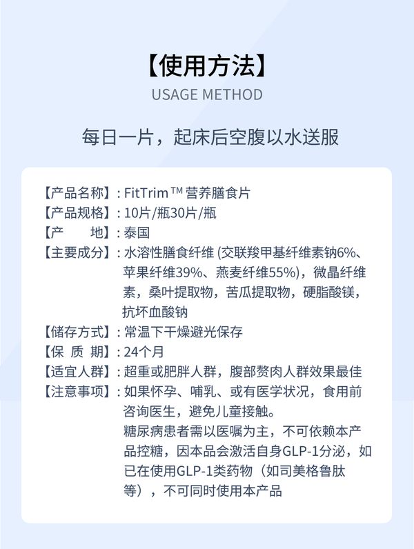 · 主要成分:水溶性膳食纤维,微晶纤维素,桑叶提取物,苦瓜提取物,硬脂酸镁,抗坏血酸钠