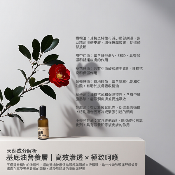 協同作用:精油是主要活性成分,針對頭痛的鎮靜、止痛和抗炎作用直接有效。基礎油則提供滋潤和載體功能,增強精油的滲透性和按摩效果,間接促進頭部放鬆和血液循環。
