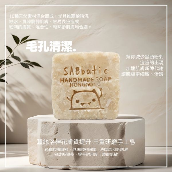 10種天然素材混合而成,尤其推薦給暗沉缺水、屏障脆弱肌膚,容易長痘痘或粉刺的膚質、混合性、輕熟齡肌膚均合適。三重研磨工藝加持,皂體結構緻密,泡沫綿密細膩,洗感溫和低刺激,熟成時期長,提升耐用度,親膚低敏。歸納功效如下: