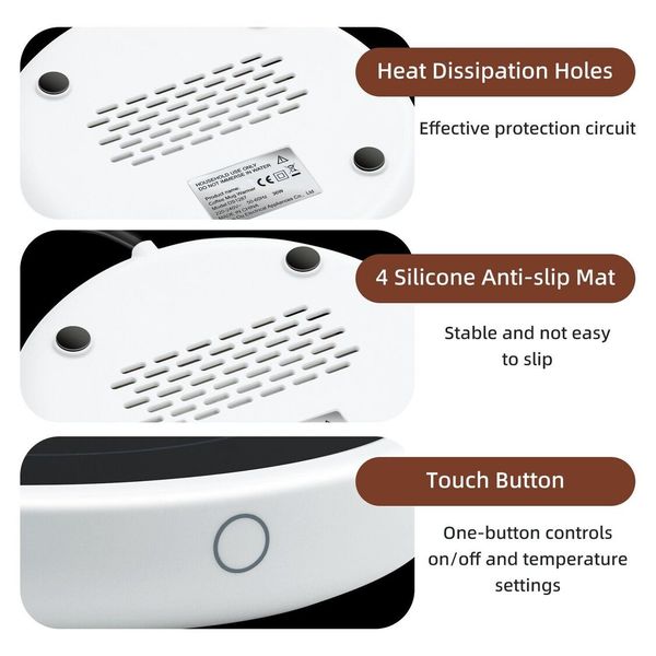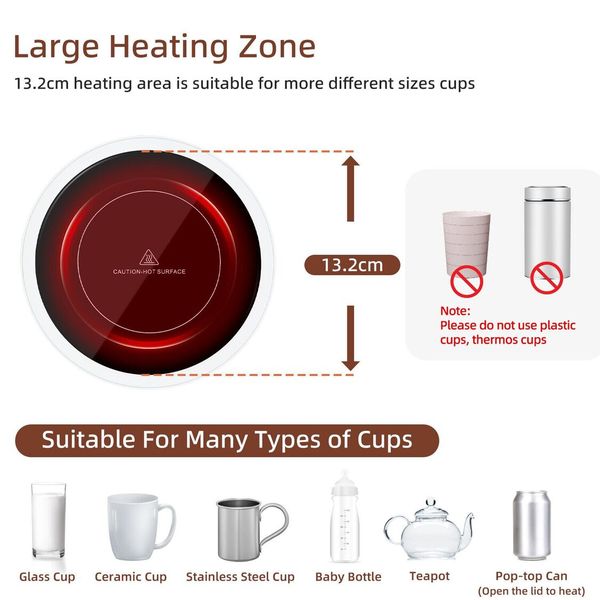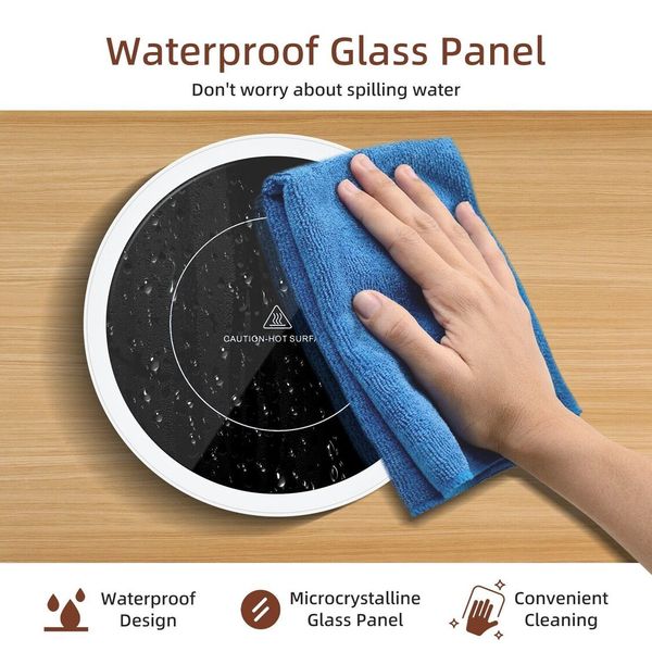 -13.2cm 直徑大加熱區,帶防水玻璃面板。適用於大多數類型的杯子:玻璃杯、嬰兒奶瓶、陶瓷杯、牛奶杯、咖啡杯、辦公杯。易於清潔。