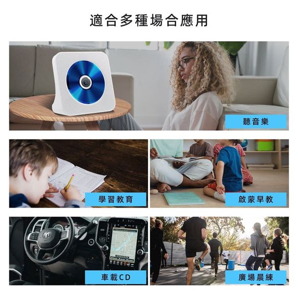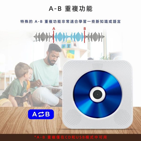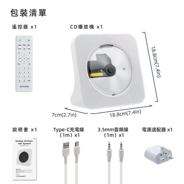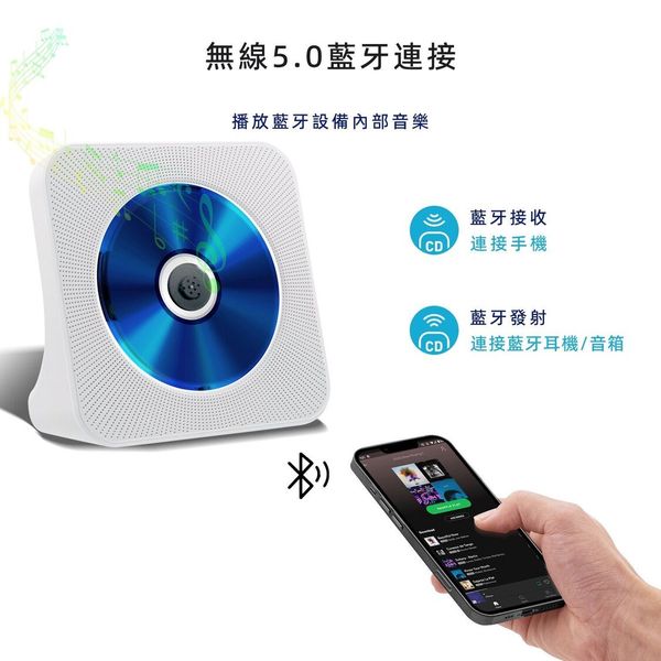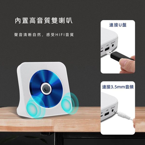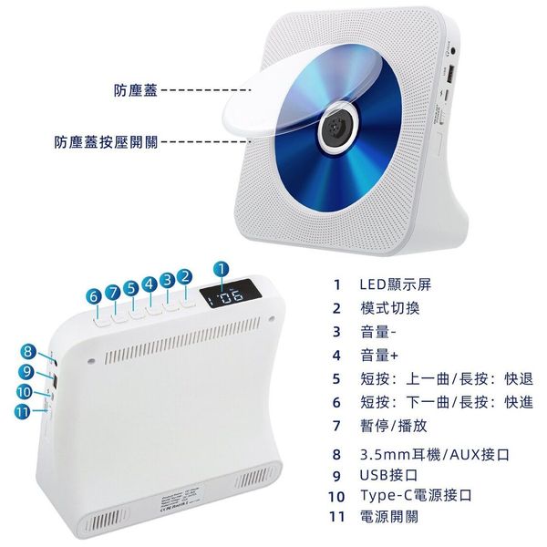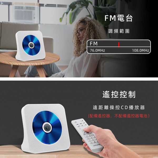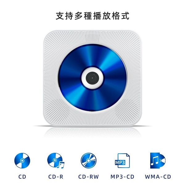 - 簡潔大方的座枱式便攜藍牙無線CD播放器,支持 CD、CD-R、CD-RW、MP3-CD、WMA-CD、USB手指和直接 AUX 線路輸入格式,內置可調頻收音機。
