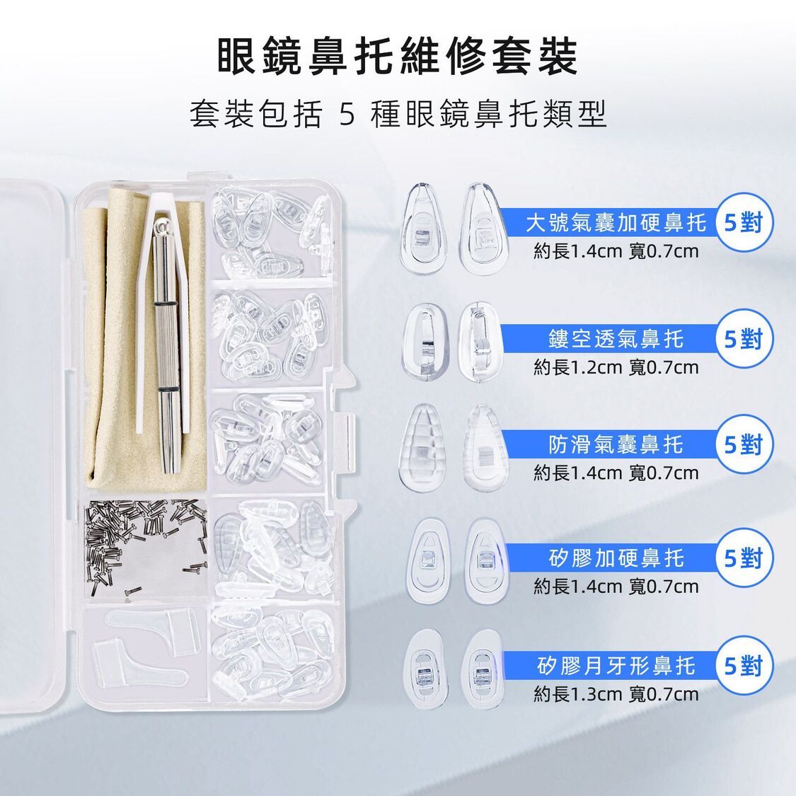 - 包裝內含:25 對透明矽膠替換鼻托 (多種款式及尺寸)、一對防滑耳勾、兩塊隔片、一枝螺絲批、一套螺絲套件、一把鑷子、一塊眼鏡布和一個收納盒。