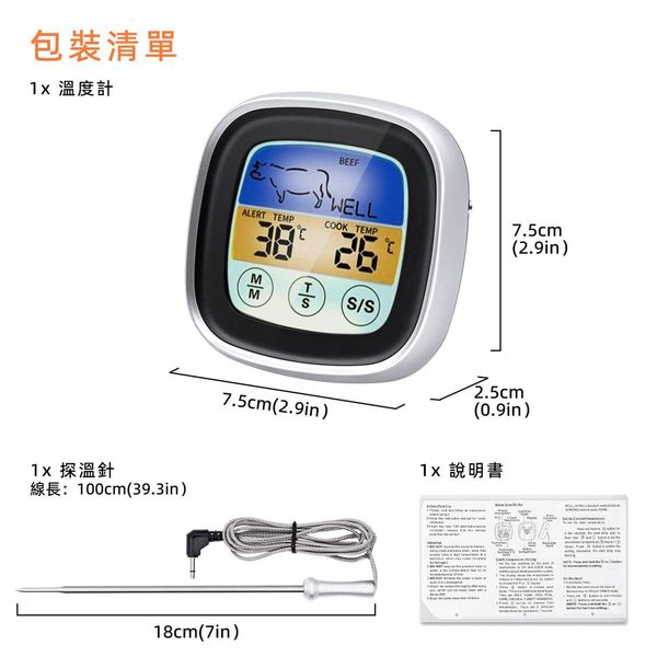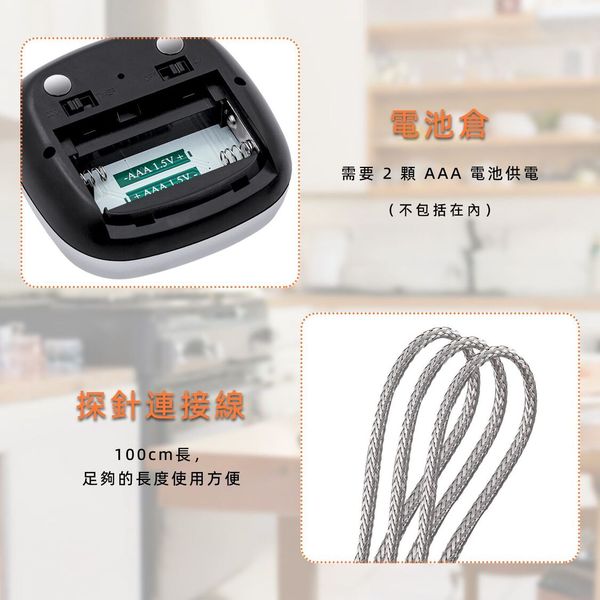 -主體不防水,請等待冷卻並取下探針進行清潔。存放前務必用熱水和肥皂沖洗並徹底乾燥探針。