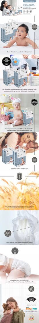 3-6 KG初生嬰兒適用,日間外出或在炎熱潮濕的天氣下適用,敏感肌寶寶也安心,最長12小時隱形守護