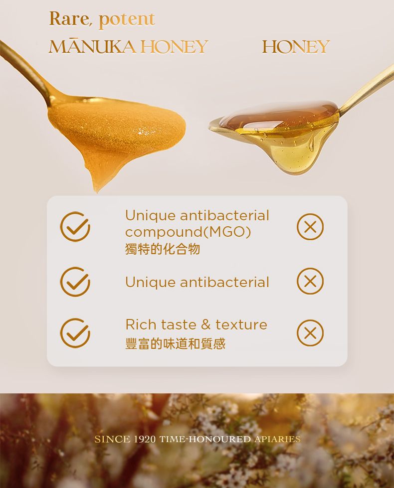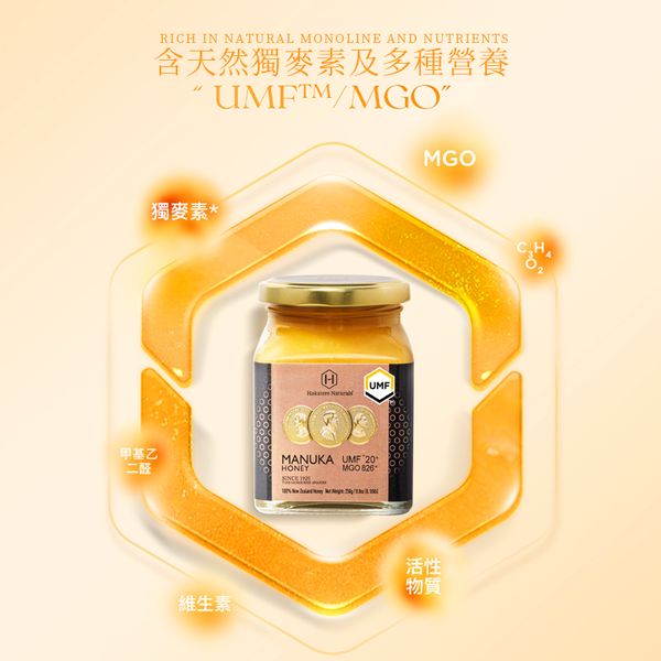 UMF20+ 巔峰活性認證:獨麥素(UMF™)與天然 MGO(甲基乙二醛)含量極高,活性強度達藥用級別,修護力卓絕。
