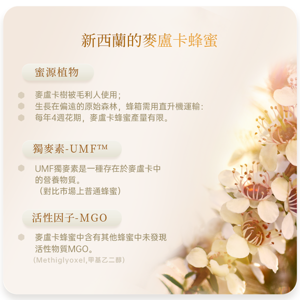 紐西蘭立法保護蜜源:僅採自紐西蘭特有麥盧卡紅茶樹,受法律嚴格監管,蜜源純淨零污染。