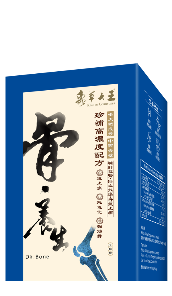 蟲草大王與香港知名大學教授共同研發,以天然名貴成分研製出《骨。養生》。有補肝益腎·活血散瘀功效。配方更加入強效消腫止痛成分,有效紓緩關節痛,同時有助改善軟骨修復。特別適合經常感到腰膝酸軟,下肢無力或有關節勞損及退化問題人士。
