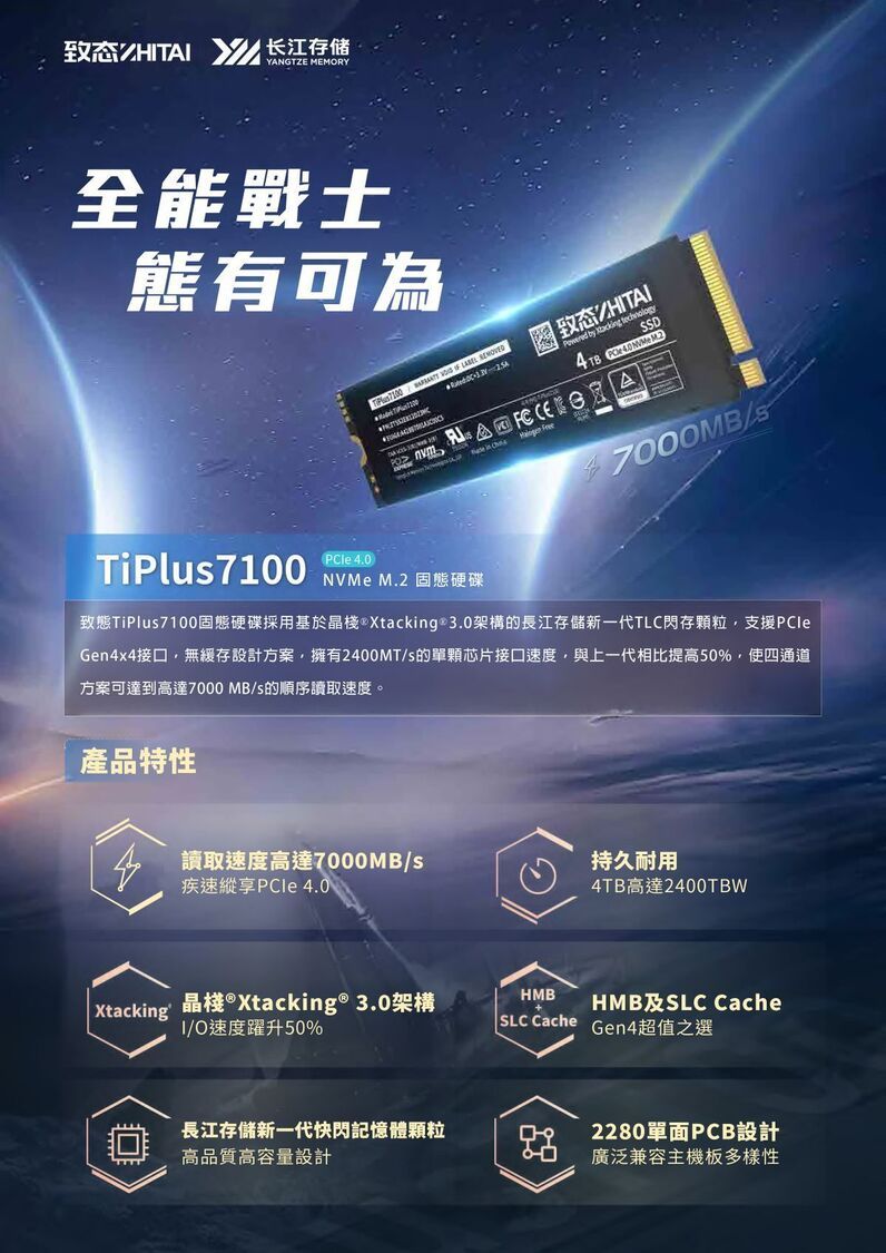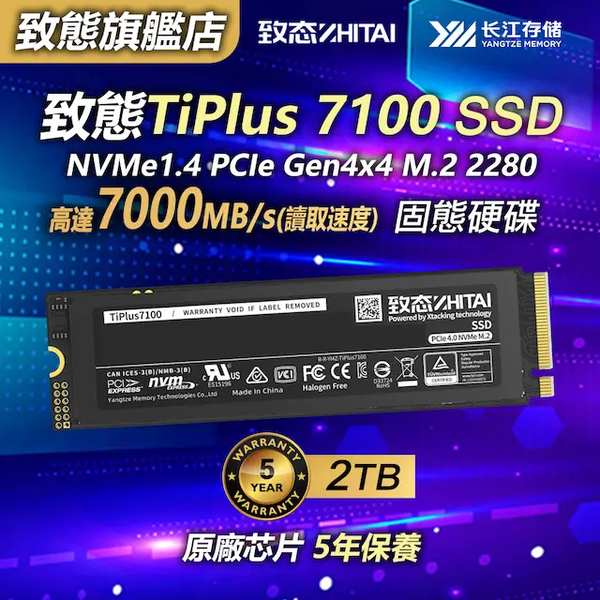 致態-TiPlus 7100 2TB(7000MB/s) NVMe1.4 PCIe Gen4x4 M.2 2280 | 內置SSD 固態硬碟