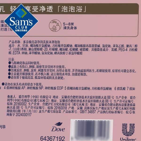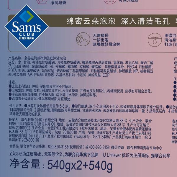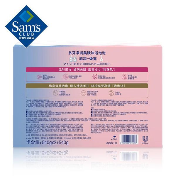 山姆會員商店 多芬(Dove)淨潤美膚沐浴泡泡滋潤+煥亮540g*2+540g 平行進口