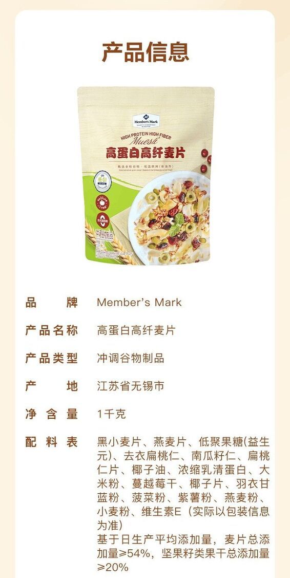 Member's Mark-山姆會員商店 Member's Mark 高蛋白高纖麥片1kg 平行進口