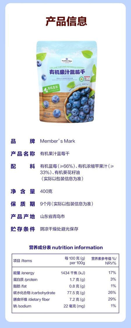 Member's Mark-山姆會員商店 Member's Mark有機果汁藍莓幹400g 平行進口
