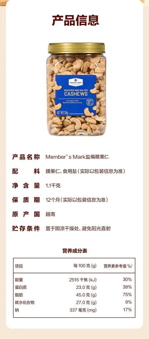 Member's Mark-山姆會員商店 Member's Mark鹽焗腰果仁1.1KG 平行進口
