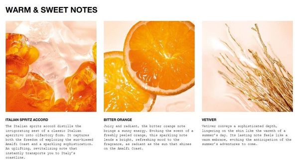 - 苦橙 - 多汁而充滿活力的苦橙香調帶來陽光般的能量。它讓人聯想到新鮮剝開的橙子的香氣,這種閃亮的香調為香水增添了明亮清爽的氣息,如同照耀在阿馬爾菲海岸的陽光般燦爛。